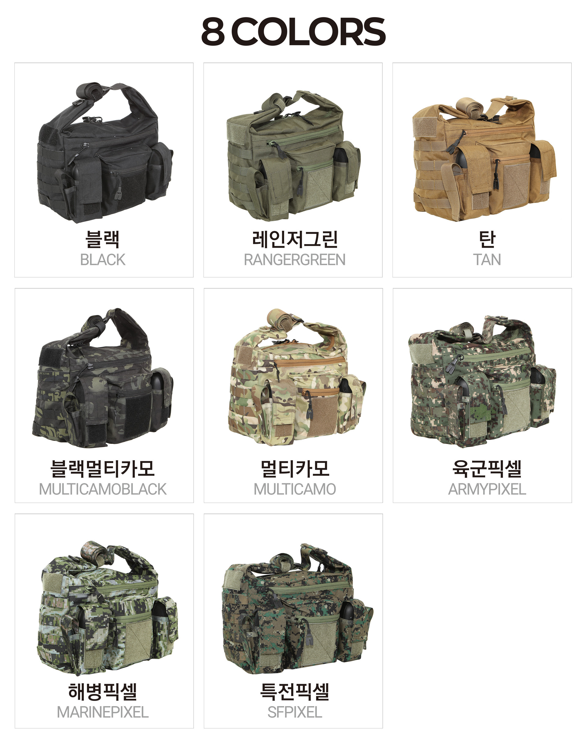 PEACE MAKER SIDE BAG은 평상시 사용하는 유틸리티 백 입니다. 다양한 수납이 가능하며 유사시에는 탄창을 수납할 수 있습니다. MOLLE와 밸크로가 적용되었고 YKK지퍼와 우진프라스틱 버클을 사용하였습니다. 블랙, 레인저그린, 탄, 블랙멀티카모, 멀티카모, 육군픽셀, 해병픽셀, 특전픽셀이 제공됩니다.